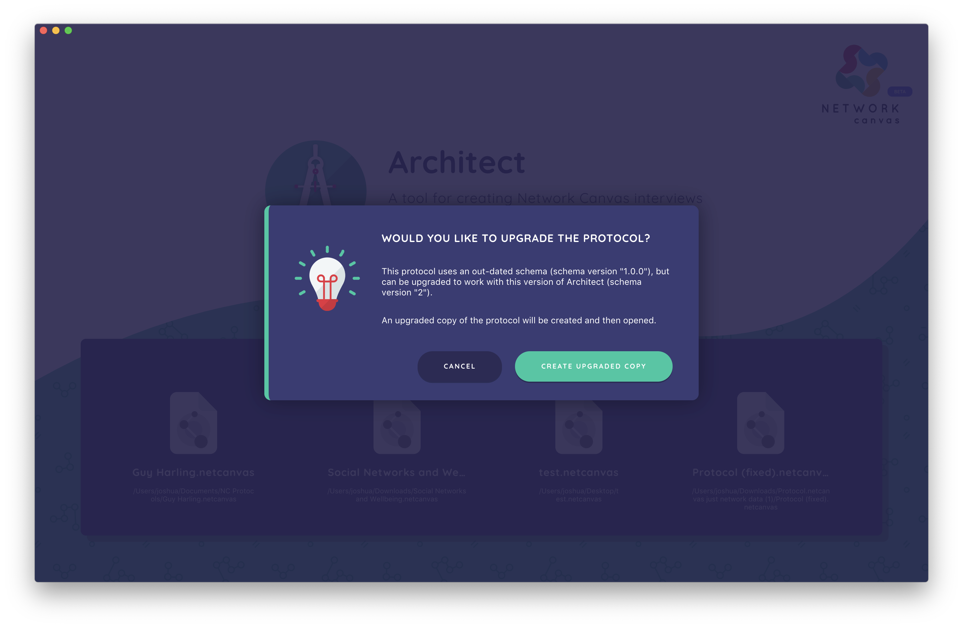 Although every effort is made to maintain compatibility with new schema versions, any features implemented that require a schema update will be unavailable to you until you migrate your protocol. We strongly encourage you to update your protocol files wherever possible, so that you are able to use the newest Network Canvas features.