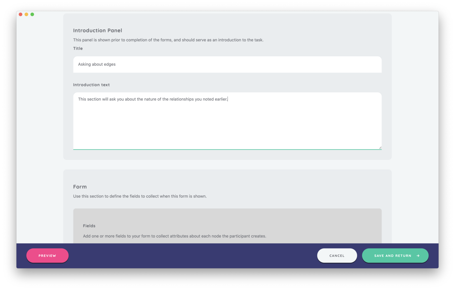 The Per Alter Edge Form is an edge interpreter interface that collects attribute data on the edges, or relationships, between nodes in a participant's network. When using the Per Alter Edge Form, participants review an introductory screen that describes the tasks on the stage and then complete a form for each edge they previously defined between pairs of alters within their network. These forms are customizable and can include one or multiple fields to collect specific edge attribute data.