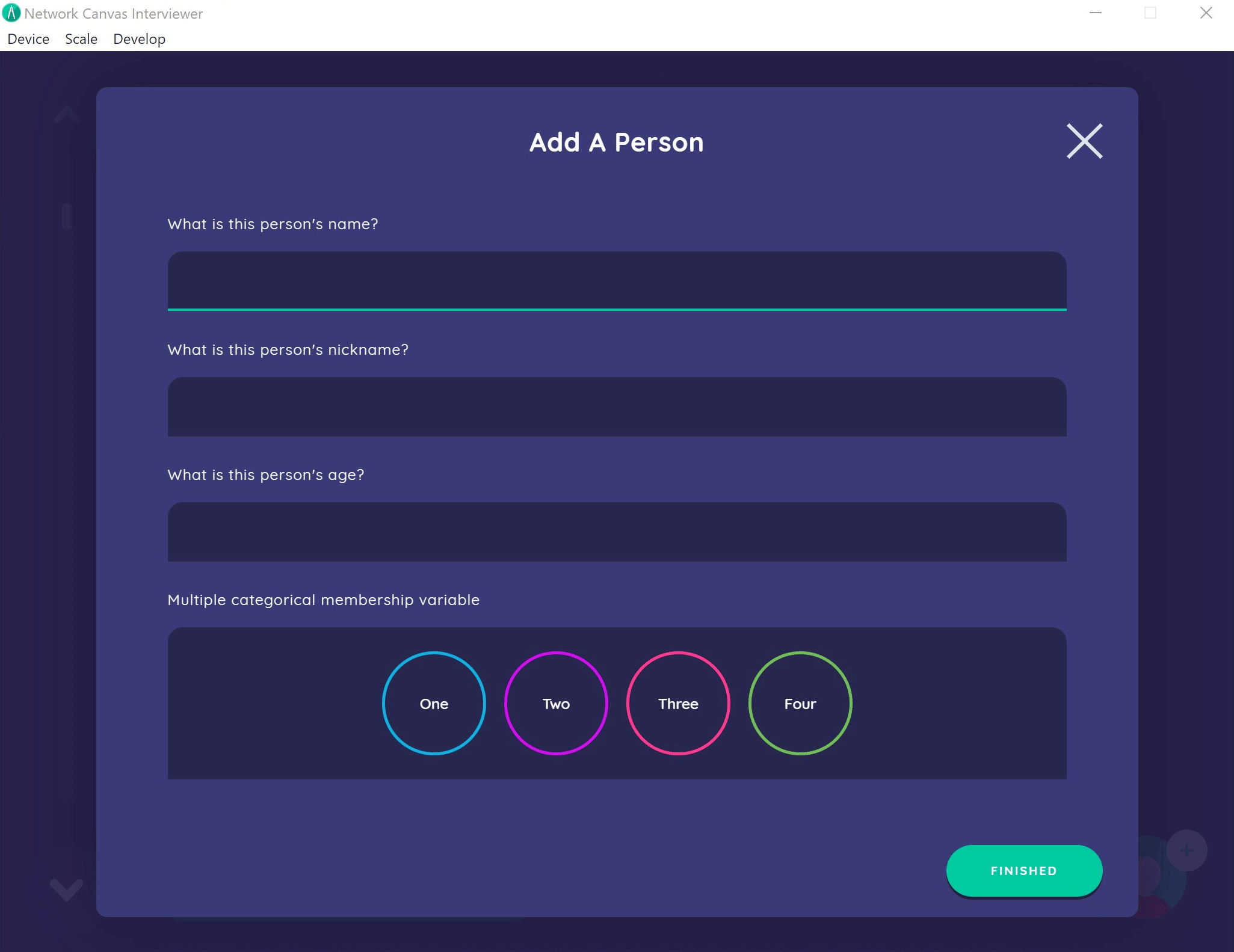 - Although it may be tempting to create long and elaborate forms, as is typical within other more traditional survey software, consider the burden of overloaded forms on participants and data quality. For example, while you can capture categorical data within a form, you might elect to use the Categorical Bin Interface instead. Network Canvas Interviewer is not intended to replace existing survey methods.