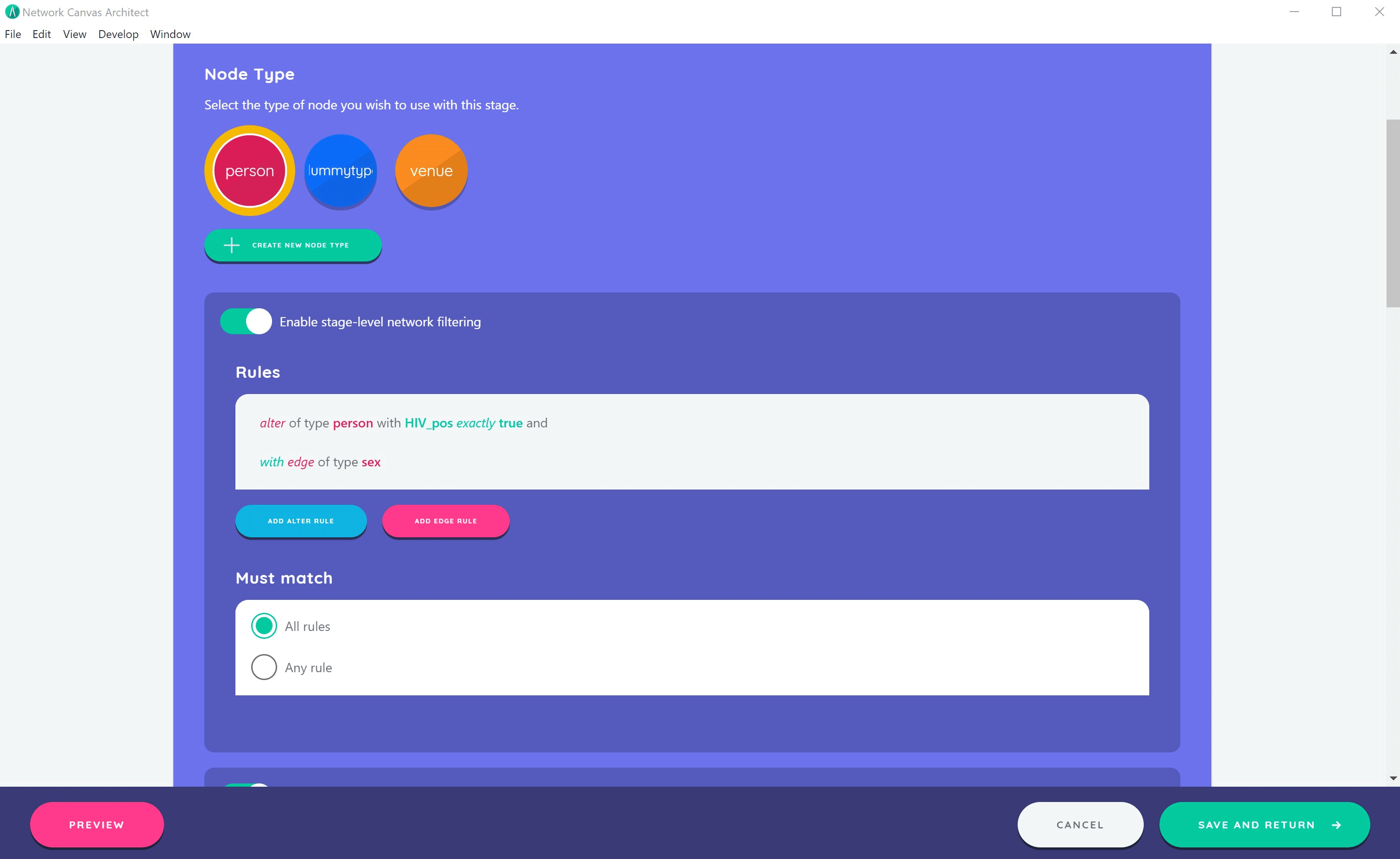 Applying these rules within this stage determines that only HIV+ nodes who have a sex relationship will be shown. All nodes that do not have a sex relationship will be filtered out - even if they have attribute HIV_pos = true.