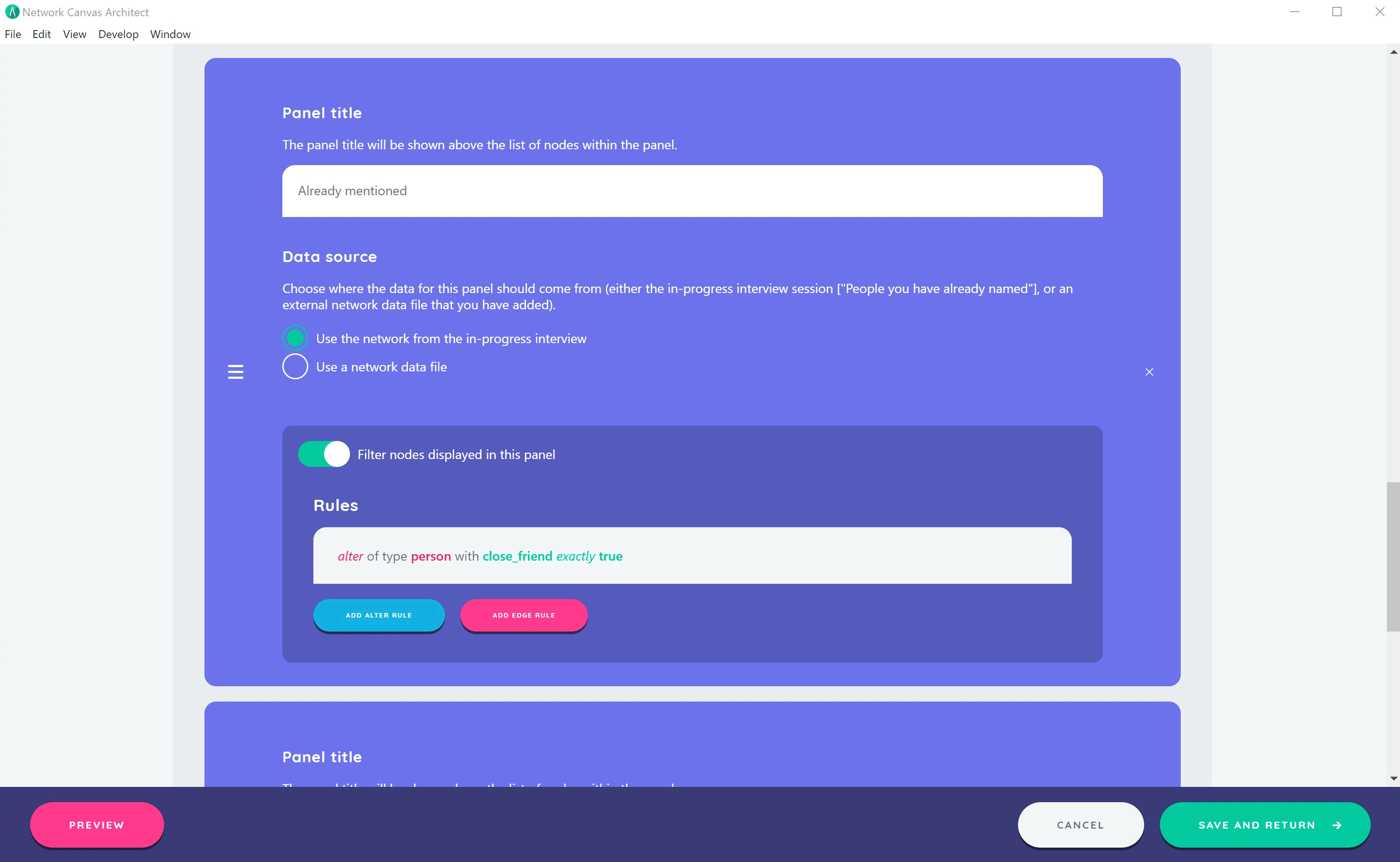 This is particularly useful in cases where the content of the stage does not apply to all network entities. Consider the example of an interview protocol with two stages - a Name Generator and an Ordinal Bin. On the first stage, for each alter named the participant is asked if they play sports with the individual. The second stage asks "how often do you play sports with each of these people?". Filtering the network for this second stage to show only those alters with the plays sports with attribute will reduce participant burden and make the interview protocol more efficient.