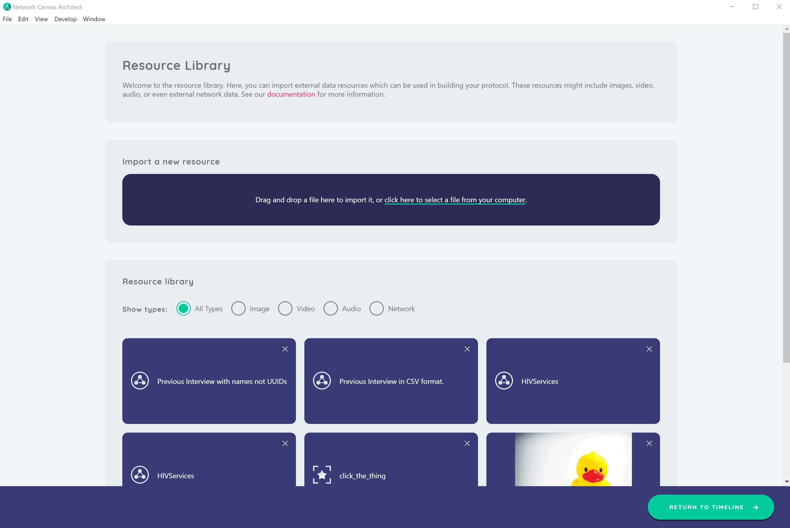Resources are external files, such as audio, images, video, and network roster data, that you can use within your interview protocol.