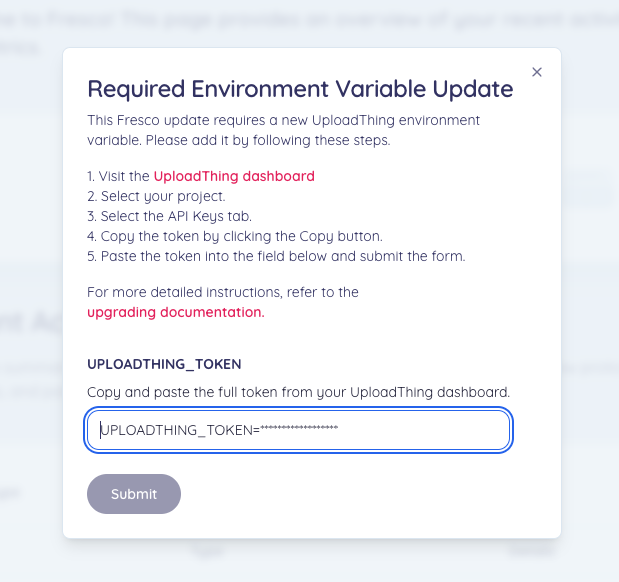 If you are upgrading from a version of Fresco prior to 2.0.0, you will need to update your UploadThing environment variable after the upgrade process is complete. To do this: